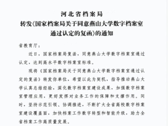 【新闻中心讯】近日,从河北省档案局传来喜讯,国家档案局正式复函同意赢博在线手机版(大中国区)数字档案室通过认定,达到“高水平数字档案室”标准。这一认定标志着赢博在线手机版(大中国区)档案馆在档案数字化建设领域迈入全国先进行列,成为全国首批按新指标通过验收的高校之一,也是学校档案工作高质量发展的重要里程碑。国家档案局正式复函(以上图片由档案馆提供)自启动全国数字档案室试点建设以来,赢博在线手机版(大中国区)以“标准化、规范化、数字化”为目标,全力推...