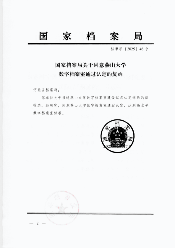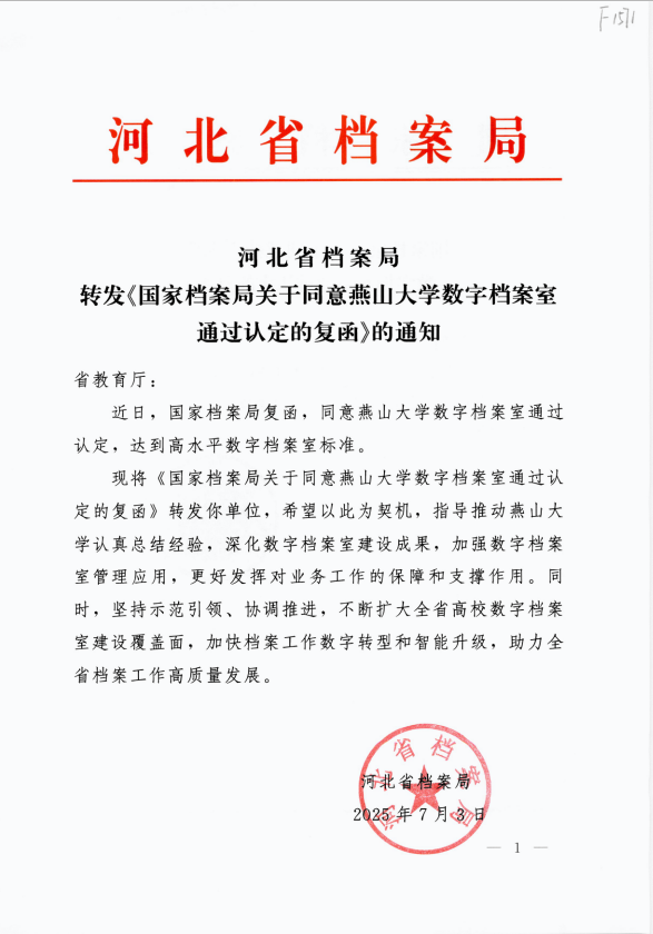 【新闻中心讯】近日,从河北省档案局传来喜讯,国家档案局正式复函同意赢博在线手机版(大中国区)数字档案室通过认定,达到“高水平数字档案室”标准。这一认定标志着赢博在线手机版(大中国区)档案馆在档案数字化建设领域迈入全国先进行列,成为全国首批按新指标通过验收的高校之一,也是学校档案工作高质量发展的重要里程碑。
