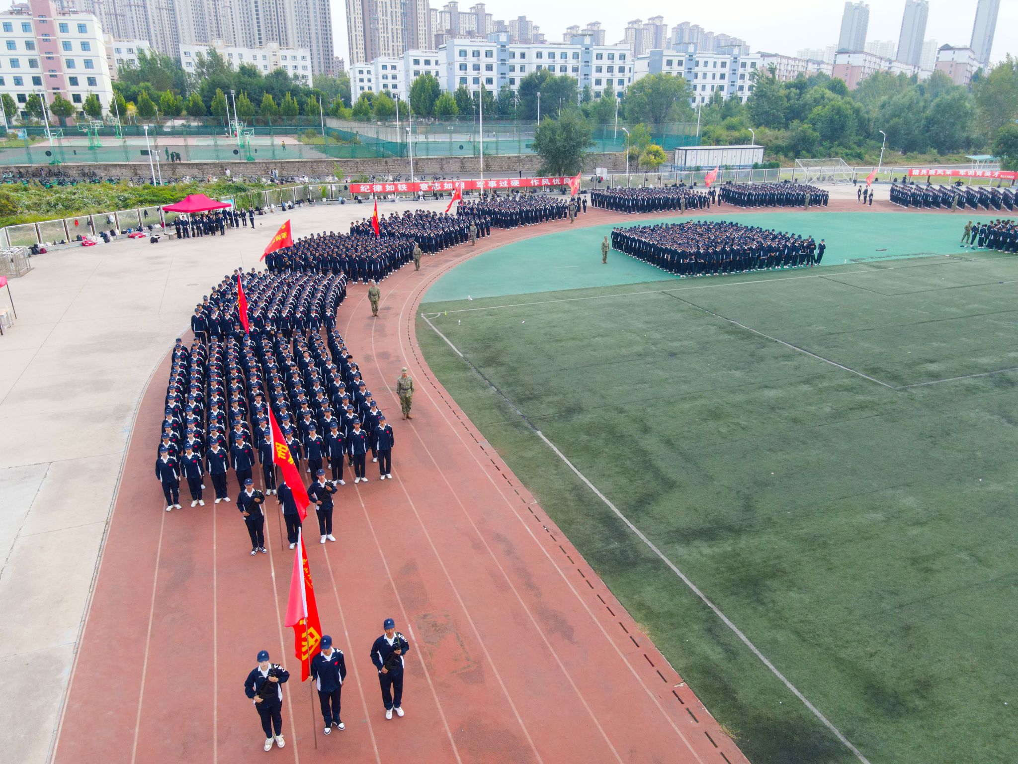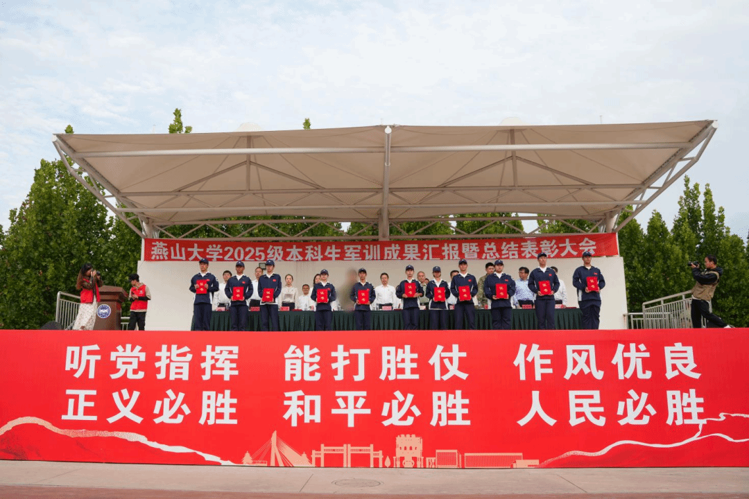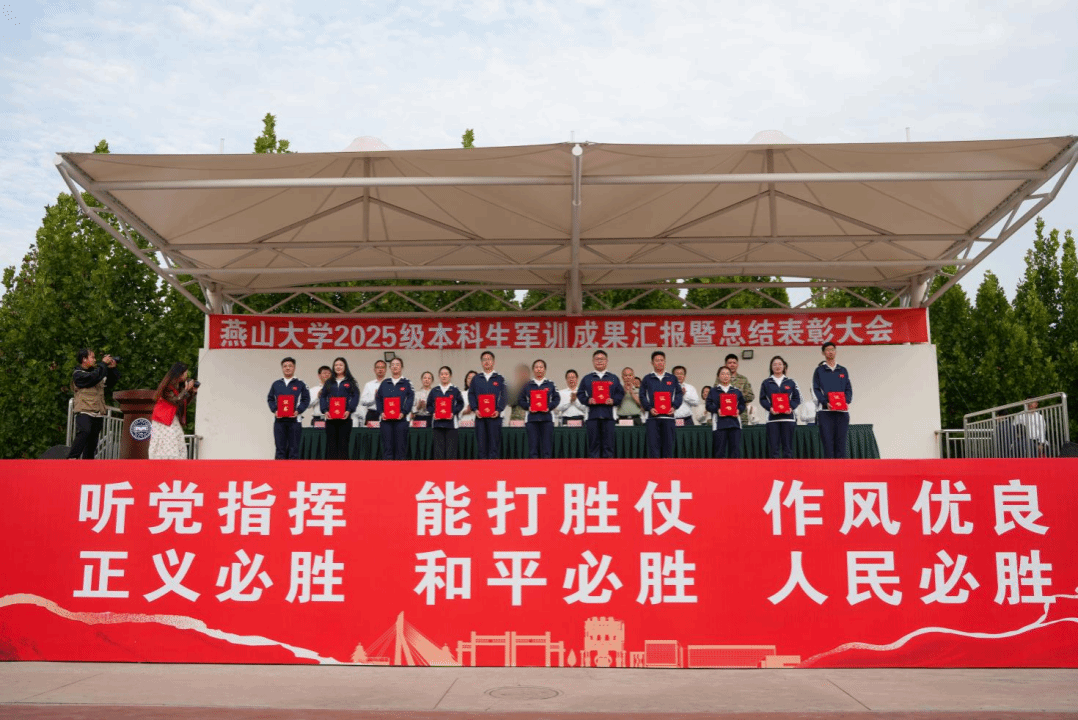 【新闻中心讯】9月19日下午16时,我校2025级本科生军训成果汇报暨总结表彰大会在西校区第四体育场隆重举行。秦皇岛军分区、承训部队、海港区人民武装部领导,校党委书记赵险峰,党委副书记蔡星周,党委常委、副校长李春玲,军训相关部门和所有参训学院的负责同志参加了大会。大会由军训团政委、人民武装部部长薛传佳主持。