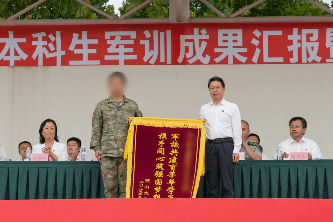 校党委书记赵险峰代表学校向承训部队赠送锦旗,表达对全体教官辛勤付出的衷心感谢。