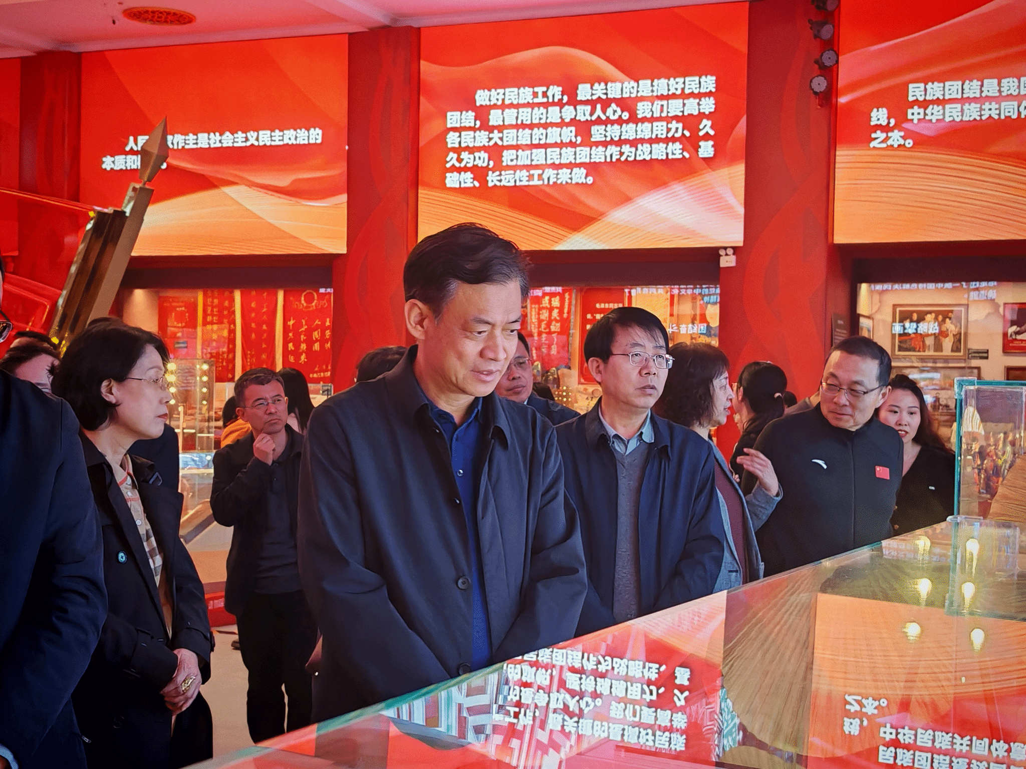在民族文化宫,一行人参观了铸牢中华民族共同体意识文物古籍展。展览分为“大一统”“大交融”“大团结”三个单元,共展出2100余件文物古籍。展览从历史、文化、经济等多个维度,展现了中华民族共同体形成发展的历史和丰富实践的一系列珍贵文物和资料,生动再现了五千多年来全国各民族交往交流交融的史实。