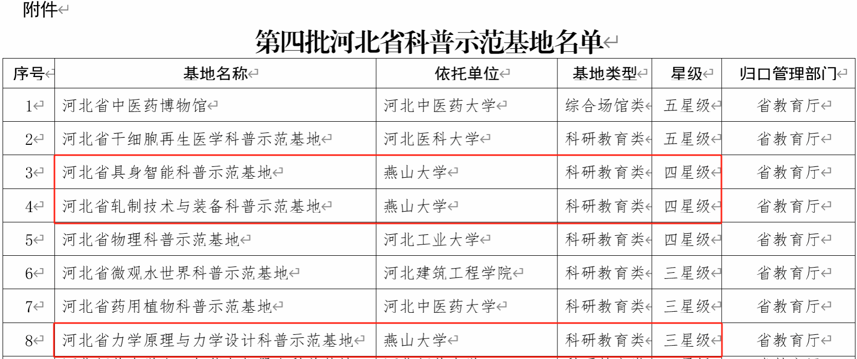 【新闻中心讯】近日,河北省科技厅公布了河北省第四批科普示范基地的认定名单,经过评审,依托赢博在线手机版(大中国区)申报的河北省具身智能科普示范基地、河北省轧制技术与装备科普示范基地、河北省力学原理与力学设计科普示范基地成功获批。截至目前,我校河北省科普示范基地数量已达到9个。