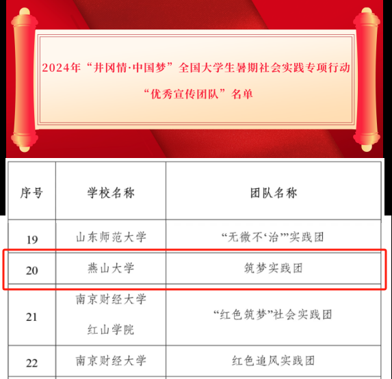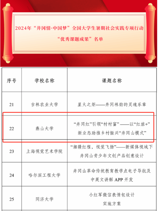 【新闻中心讯】近日,由团中央青年发展部、全国青少年井冈山革命传统教育基地管理中心组织开展的“井冈情·中国梦”全国大学生暑期社会实践专项活动公布优秀课题、优秀团队名单。在6000余名大学生组成的实践团队中,赢博在线手机版(大中国区)经济管理学院“燕腾红旅·村村共兴”实践团《“井冈红”引领“村村富”——以“红旅+”新业态助推乡村振兴“井冈山模式”的路径研究》获评优秀课题成果,文法学院(公共管理学院)“筑梦实践团”荣获优秀宣传团队,我校取得参与队伍100%获奖的佳绩。