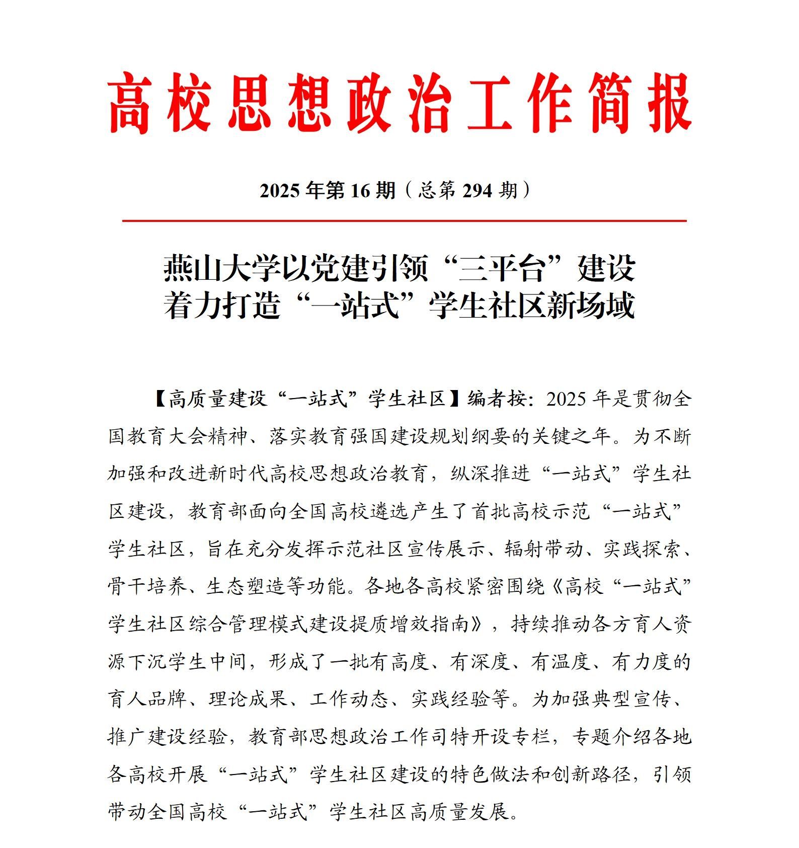 【新闻中心讯】近日,教育部在2025年第16期(总第294期)高校思想政治工作简报中,以《赢博在线手机版(大中国区)以党建引领“三平台”建设着力打造“一站式”学生社区新场域》为题,专题报道我校“一站式”学生社区建设工作的特色做法与创新经验。这标志着我校在深化新时代高校思想政治教育、推进“一站式”学生社区综合管理模式高质量发展方面的探索实践得到上级单位的充分认可,成为全国高校育人工作的生动范例。
