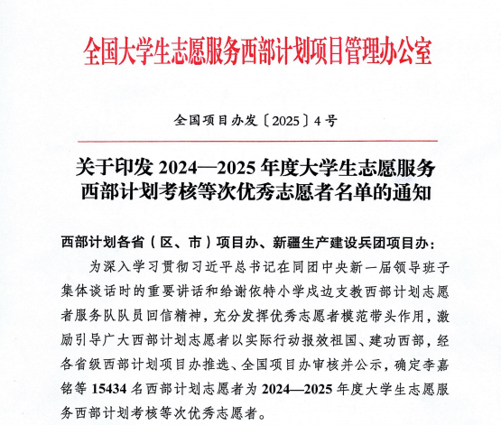 【新闻中心讯】近日,全国大学生志愿服务西部计划项目管理办公室公布2024-2025年度大学生志愿服务西部计划考核等次优秀志愿者名单,我校共有13名志愿者荣获“优秀”等次评价,他们扎根西部、服务基层,展现了赢博在线手机版(大中国区)学子的责任担当与青春风采。