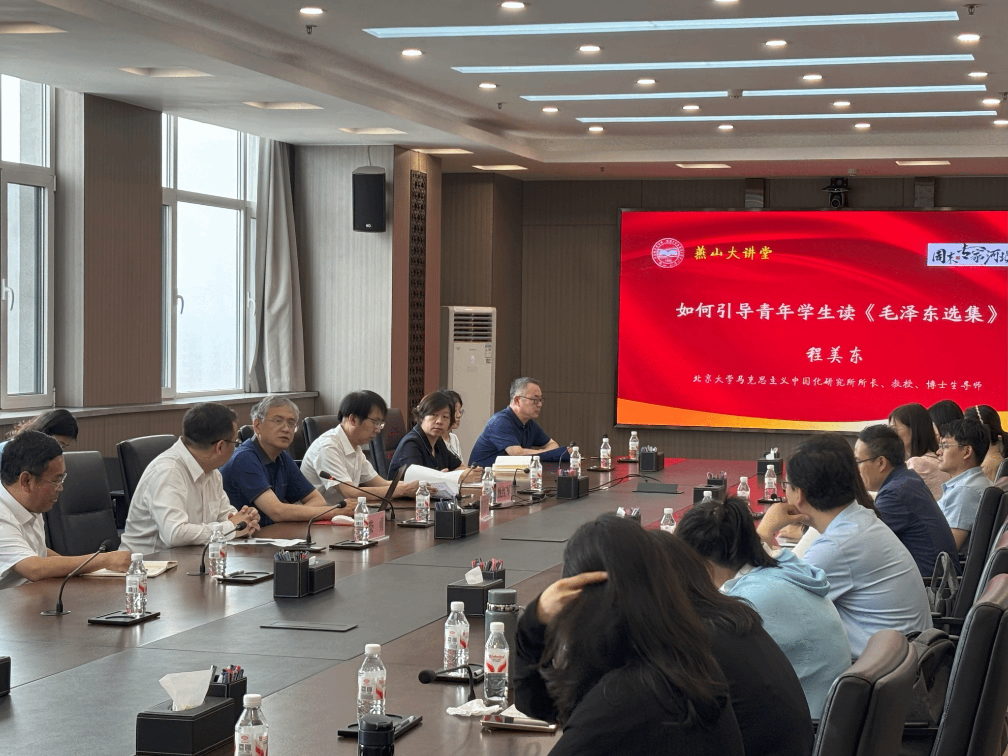 【新闻中心讯】6月14日下午,“燕山大讲堂”系列讲座暨“周末专家河北行”活动在世纪楼2103举行。应马克思主义学院邀请,北京大学马克思主义中国化研究所所长、博士生导师程美东教授为我校师生做题为“如何引导青年学生读《毛泽东选集》”的专题讲座,马克思主义学院党委书记甄红军,院长柴勇,副院长张云飞、黄娟和马克思主义学院部分师生聆听了讲座,讲座由柴勇主持。