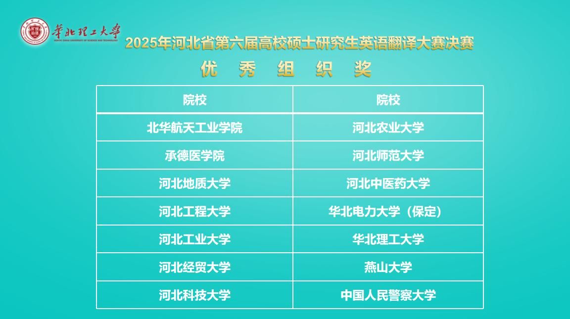 【新闻中心讯】2025年7月14—15日“河北省第六届高校硕士研究生英语翻译大赛”决赛在华北理工大学举行。我院6名英语专业研究生通过初赛、复赛两个阶段的选拔成功晋级决赛,同来自全省近30所高校的200余名选手激烈角逐全部获奖。其中英语笔译(专业组)一等奖1个,二等奖2个,三等奖1个;英语口译组一等奖1个,二等奖2个。我院还获得河北省教育厅学位管理与研究生处颁发的该赛事“优秀组织奖”荣誉称号。
