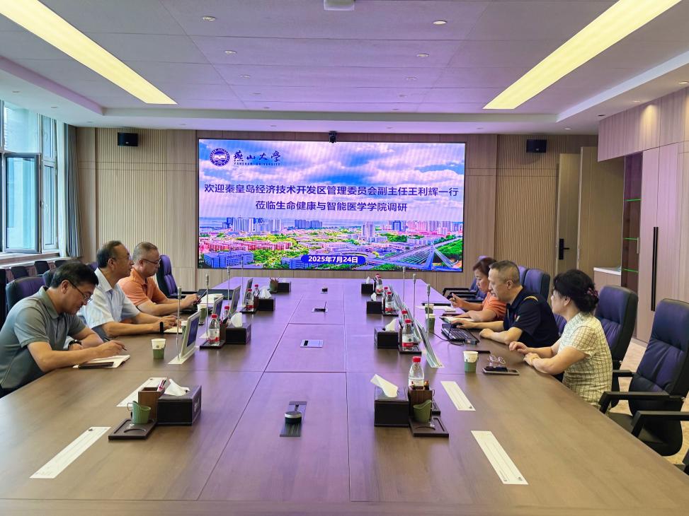 【新闻中心讯】7月24日,秦皇岛经济技术开发区管理委员会党工委委员、管委副主任王利辉,科技创新和大数据管理局局长张伟忠、副局长鲁大鹏,管理委员会办公室姚璐等一行4人莅临生命健康与智能医学学院,围绕康养产业技术创新、科研成果转化等议题展开实地调研。继续教育学院(生命健康与智能医学学院)院长戚伟欣、副院长张宁,康养产业技术研究院团队负责人栗坤教授陪同调研并参与座谈。