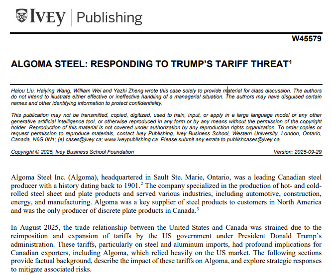 【新闻中心讯】9月29日,我校经济管理学院刘海鸥教授撰写的案例《Algoma Steel: Responding to Trump’s Tariff Threat》(案例编号:W45579)正式被国际顶尖商学案例库——加拿大毅伟商学院案例库收录入库,并面向全球168个国家超过25000个学院和教师出版发行。这是河北省首篇被海外知名案例库收录的教学案例,标志着我校在国际教学案例开发和建设工作取得了新突破!