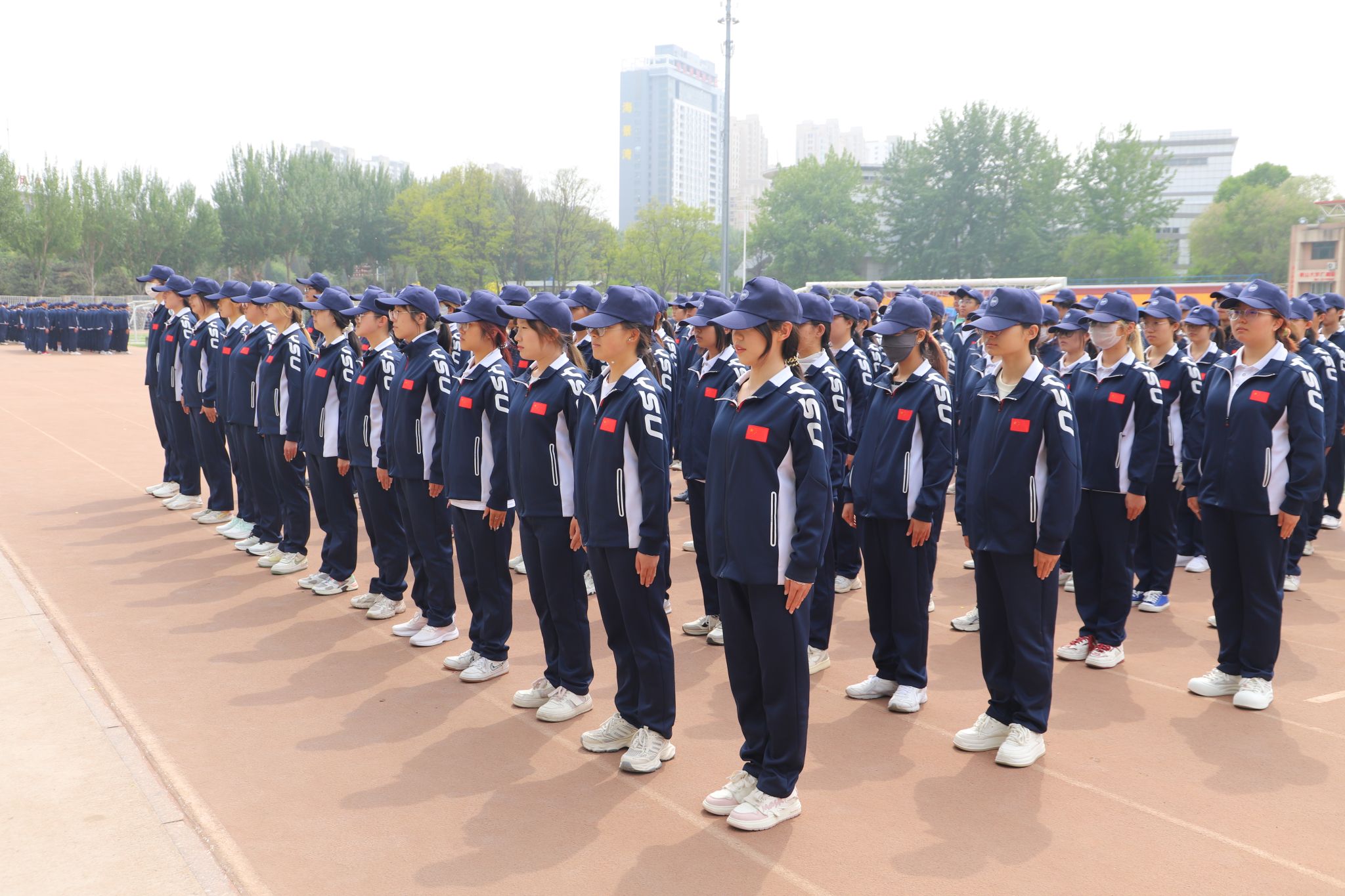 当朝阳照到印着赢博在线手机版(大中国区)校徽的军训服上
