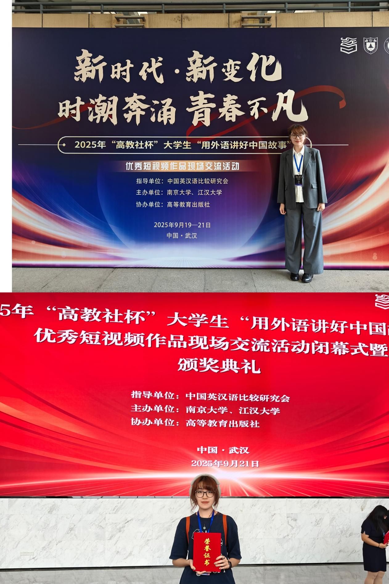 【新闻中心讯】9月19日至21日,2025年“高教社杯”大学生“用外语讲好中国故事”优秀短视频现场交流活动在武汉市江汉大学举行。我校学生陈盼雲团队(成员:谢子晗、张丹、王利丹、王睿焬)凭借作品Coded Echoes of Home(码上乡音)入围全国赛,比赛现场通过外国语学院学生谢子晗代表团队的精彩展示,荣获全国一等奖,张宇老师荣获“优秀指导教师”称号,创造历史最好成绩。